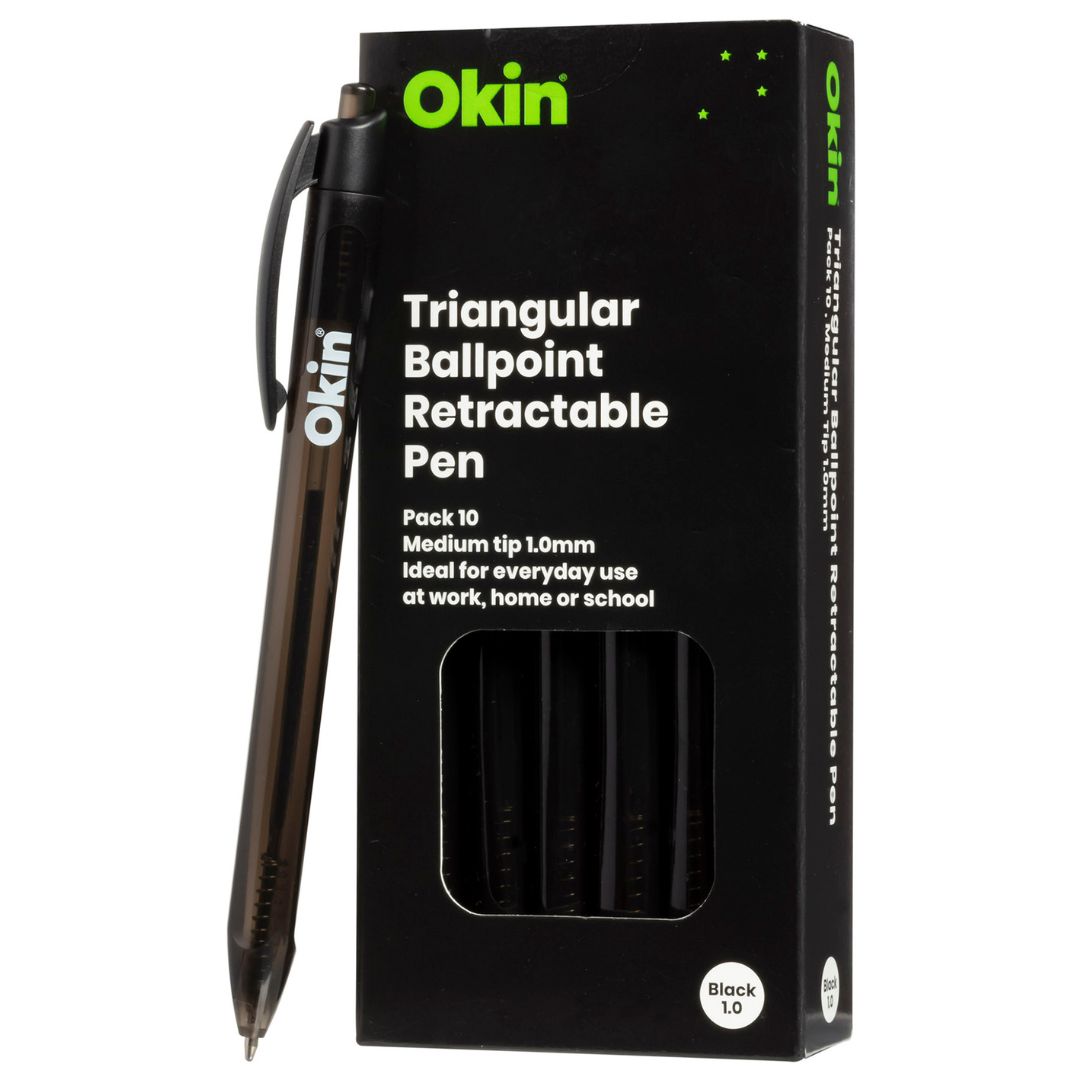 Okin retractable ballpoint pens with triangular barrel are ideal for everyday use at work, home or school. They have a high quality ink that is waterproof...