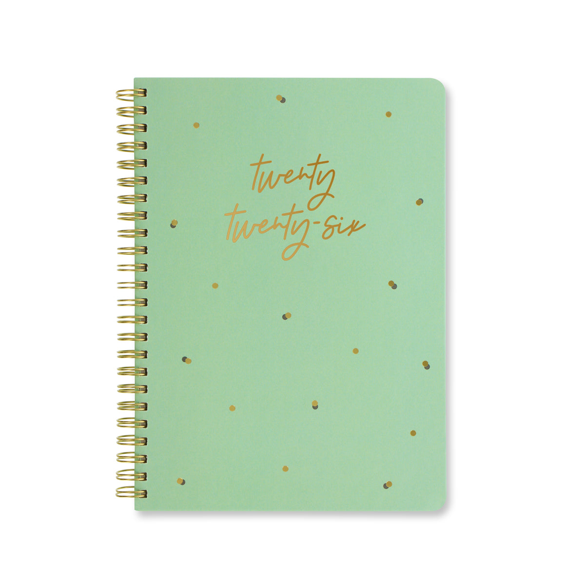 Letts of London Diary Celebrate A5 Week to View in Mint Green. This diary features a polka-dot print and beautiful foiled details. It's the perfect tool for you to record the year in! \n\n\nFEATURES\n \n- Social diary style \n\n- Multilanguage \n\n- White paper\n\n- From sustainable sources \n\n- Wiro construction \n\n- Double-sided pocket \n\n- Pop-out accessories \n\n- Gold foil motif