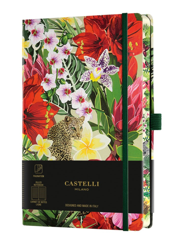 This notebook shows a flourishing nature, creating magic and charming atmospheres. The edges are embellished with floral digital printing. Rigid cover and round corners, with an expanding pocket on the inside back cover to keep your travel tickets, loose sheets, and many other valuable memories. The handy elastic band allows the perfect closure of your diary and the elastic pen loop is suitable for different pen sizes. The prestigious black endpapers are branded with Castelli Milano in gloss gold foil. The smooth cream paper gives you a pleasant experience in writing. The thread is sewn binding guarantees an excellent wear resistance and allows a 180-degree opening, the optimal solution for frequent and comfortable writing. • Cream paper • Black endpapers • Expanding pocket inside back cover • Bookmark • Elastic closure band • Pen loop • Fsc ® certified. Dimensions: 14 × 9 cm Brand: Castelli No. Of Papers: 96 Paper Weight: 85 gm Pattern: Line