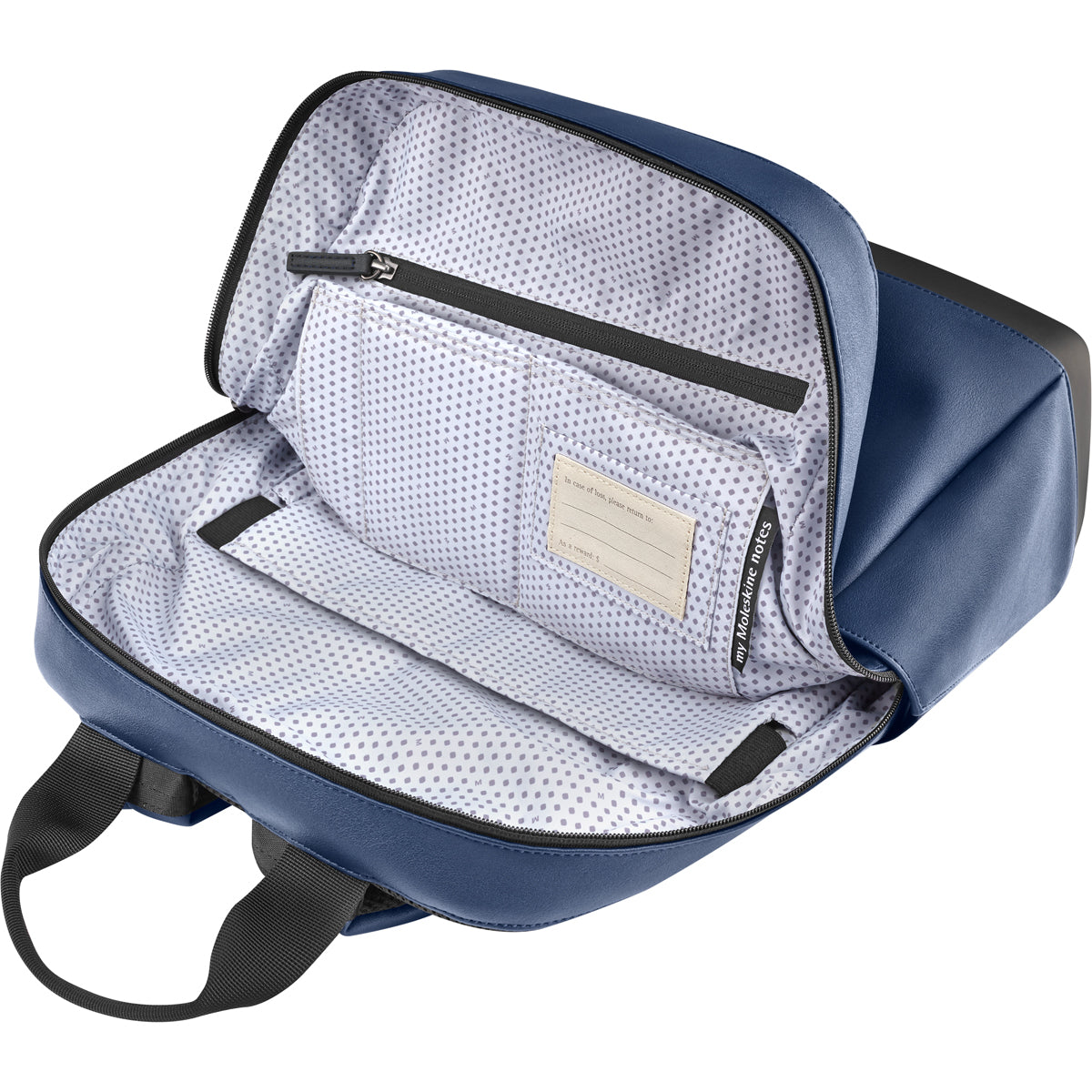The updated Classic sapphire blue Backpack is lighter, more streamlined and more comfortable, while remaining as quietly elegant as ever. Its neat exterior opens to reveal a padded laptop sleeve alongside plenty of space to carry the things you never leave home without. Full length, expandable side pockets on the outside are perfect for the items you want to keep within easy reach, while the interior features a large zip pocket, small notebook pocket, a padded compartment for glasses, and a pen holder. Interior: one main zip compartment, stay connected: padded laptop sleeve: 25 x 37 cm, 1 secure zip-up pocket and 1 organizer with a pen holder, padded pocket for glasses and business card holder, my Moleskine notes pocket to store ideas: fits Moleskine pocket notebook, azure lining with Moleskine pattern to better see your belongings (100% polyester), volume: 16 LT, Exterior: 2 side pockets to keep essentials within easy reach, elasticated to hold more when necessary, adjustable padded backpack straps with sliding buckles (new design) for a classic fit on the move,