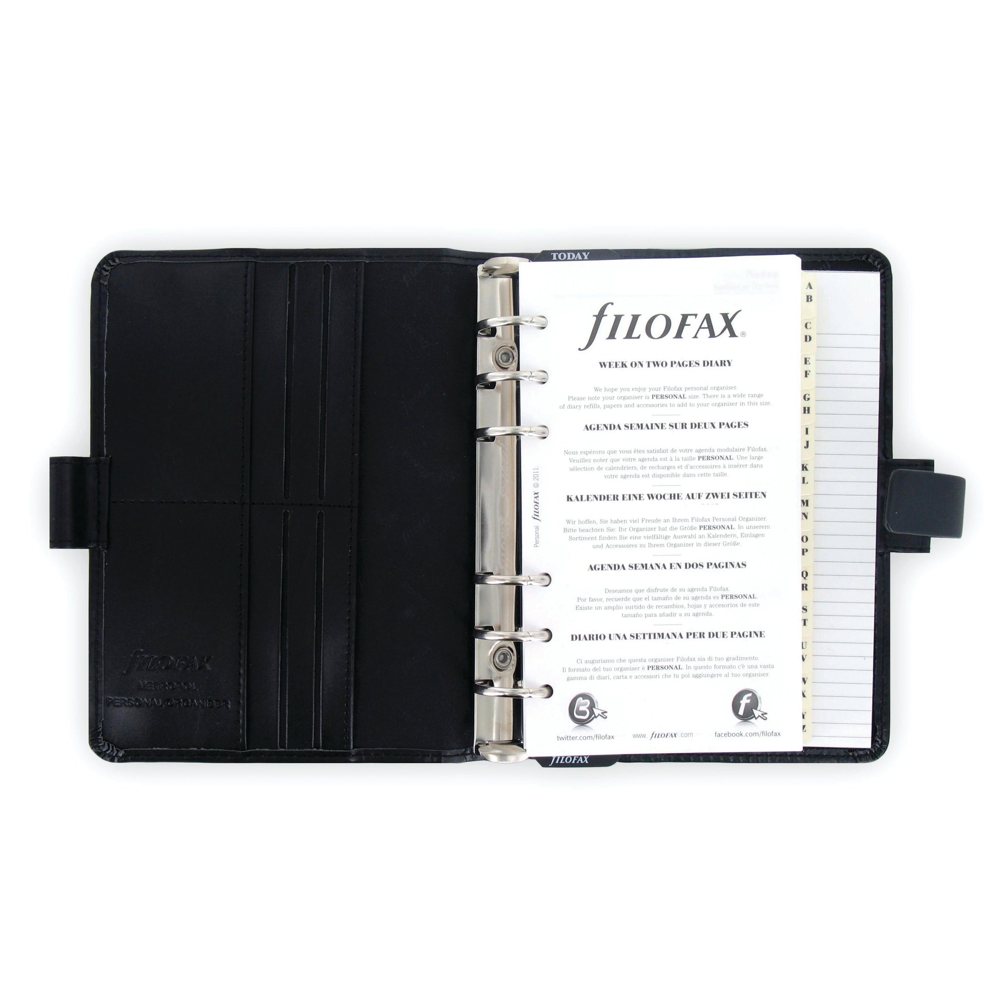 With clean lines and a sleek silhouette, Metropol remains a favourite. A smart and practical A4 organiser for everyday use. Faux-leather with strap closure. Ring mechanism 25mm. Width 255mm, Height 320mm, Depth 40mm. Contents: undated fill, ruler/page marker, to do, contacts, indices, notepaper, white ruled A4 notepad. Right Hand Details: one notepad pocket, one PU pen loop. Left Hand Details: ten card pockets, three vertical slip pockets, one PU pen loop.
