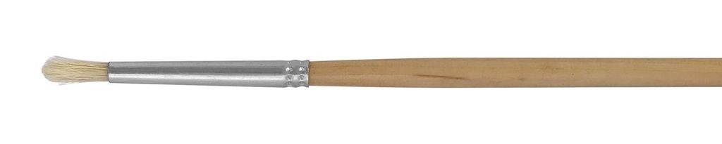 Economical round artist brush made from pure soft Chinese hog bristle. This brush has seamless ferrules and a long clear polished wooden handle.