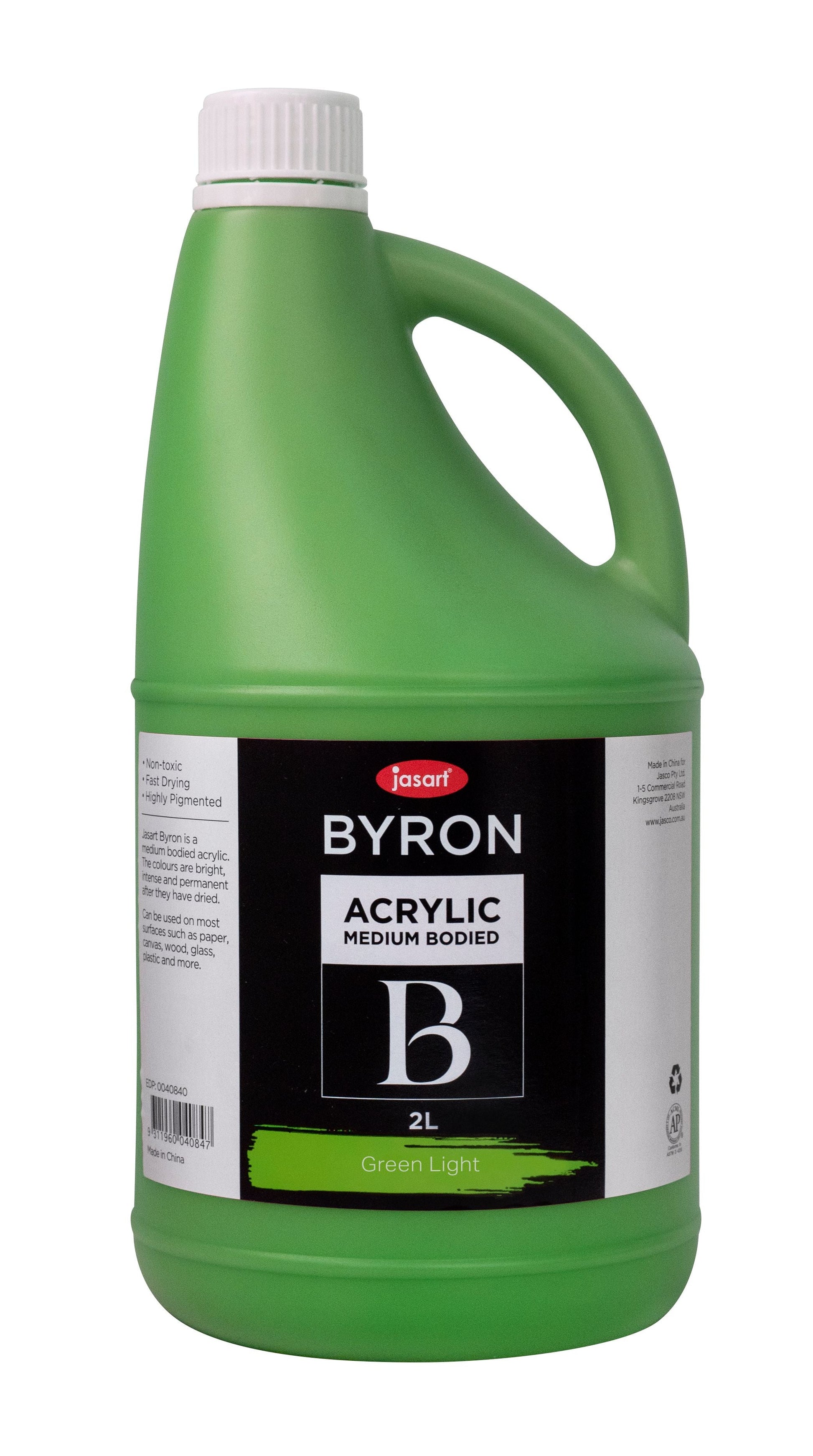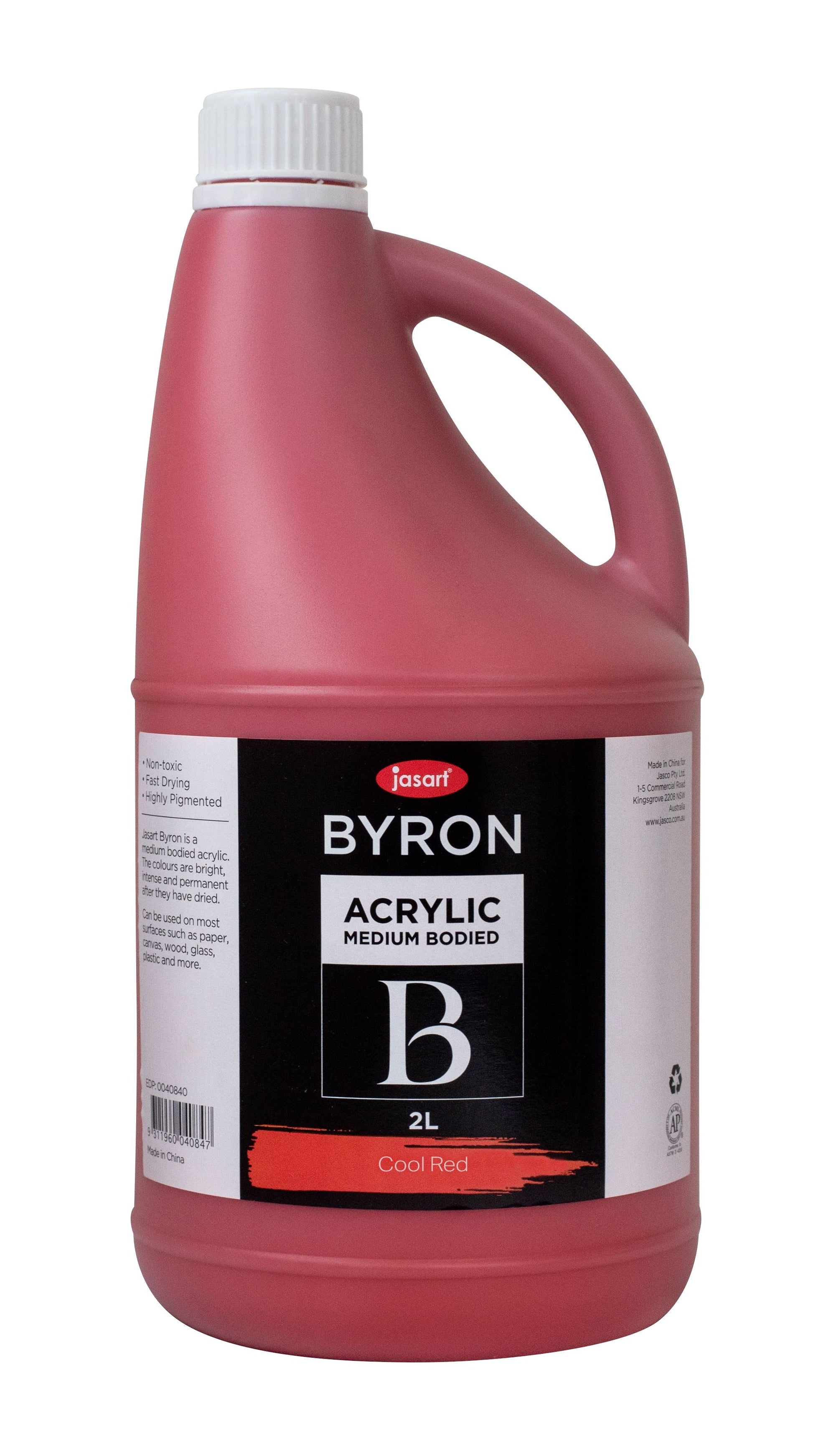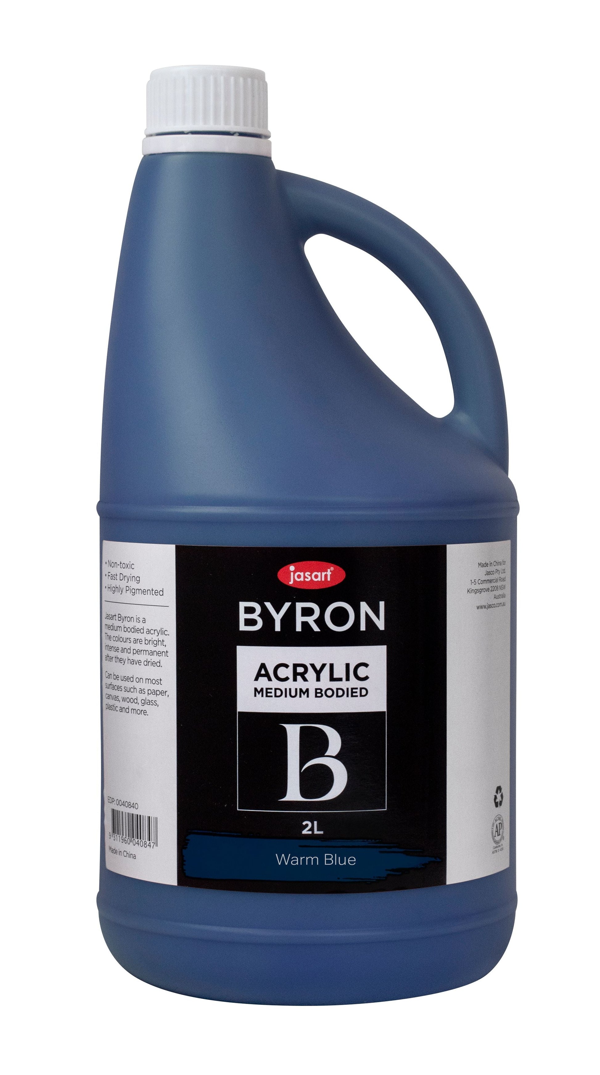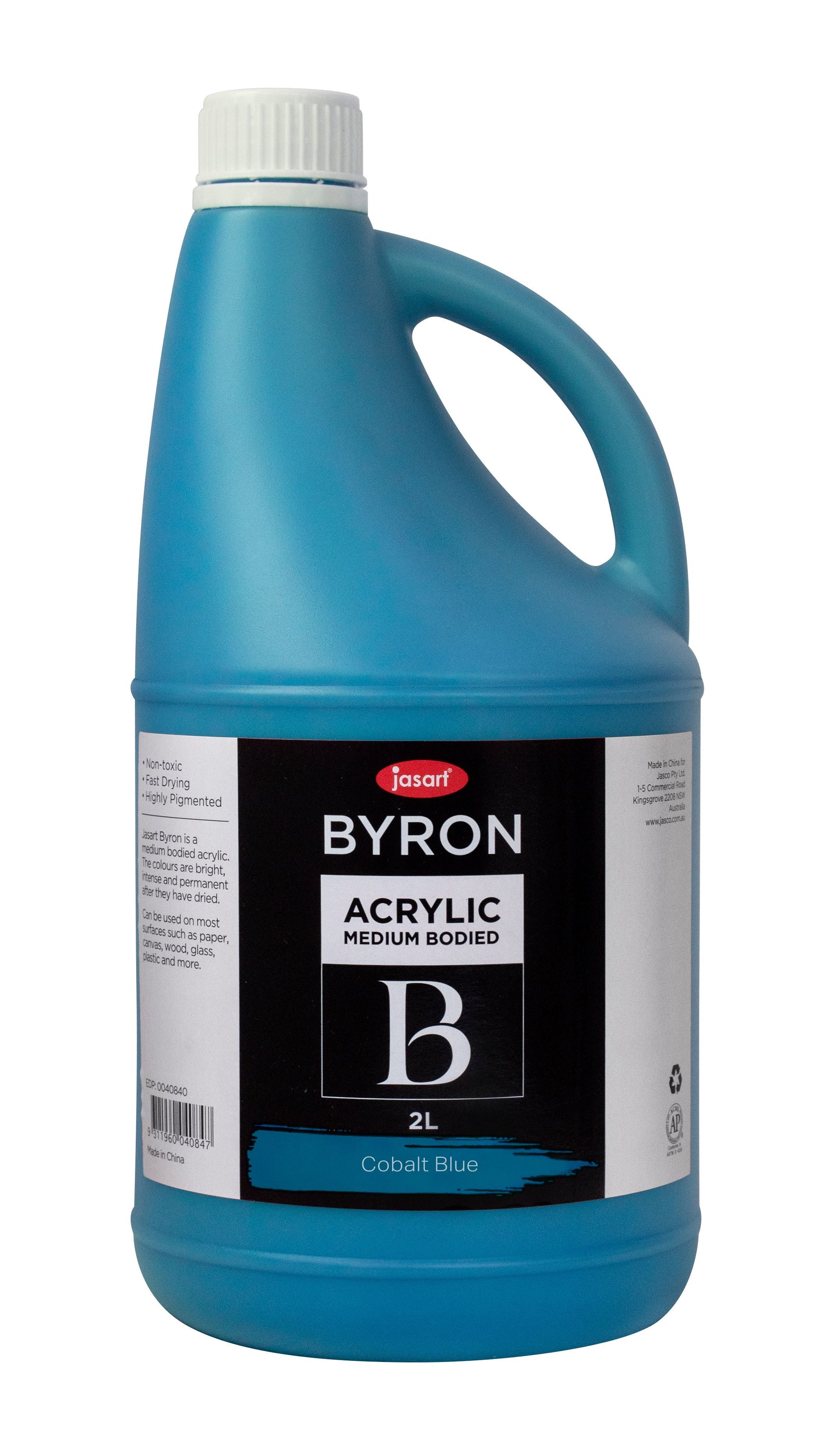 Jasart byron is a medium-bodied acrylic. The colours are bright, intense and permanent after they have dried. Can be used on most surfaces such as paper, canvas, wood, glass, plastic and more. Warm and cool primary colours will allow you to have superior colour mixing. Non toxic. 2L bottles are available in 18 colours.